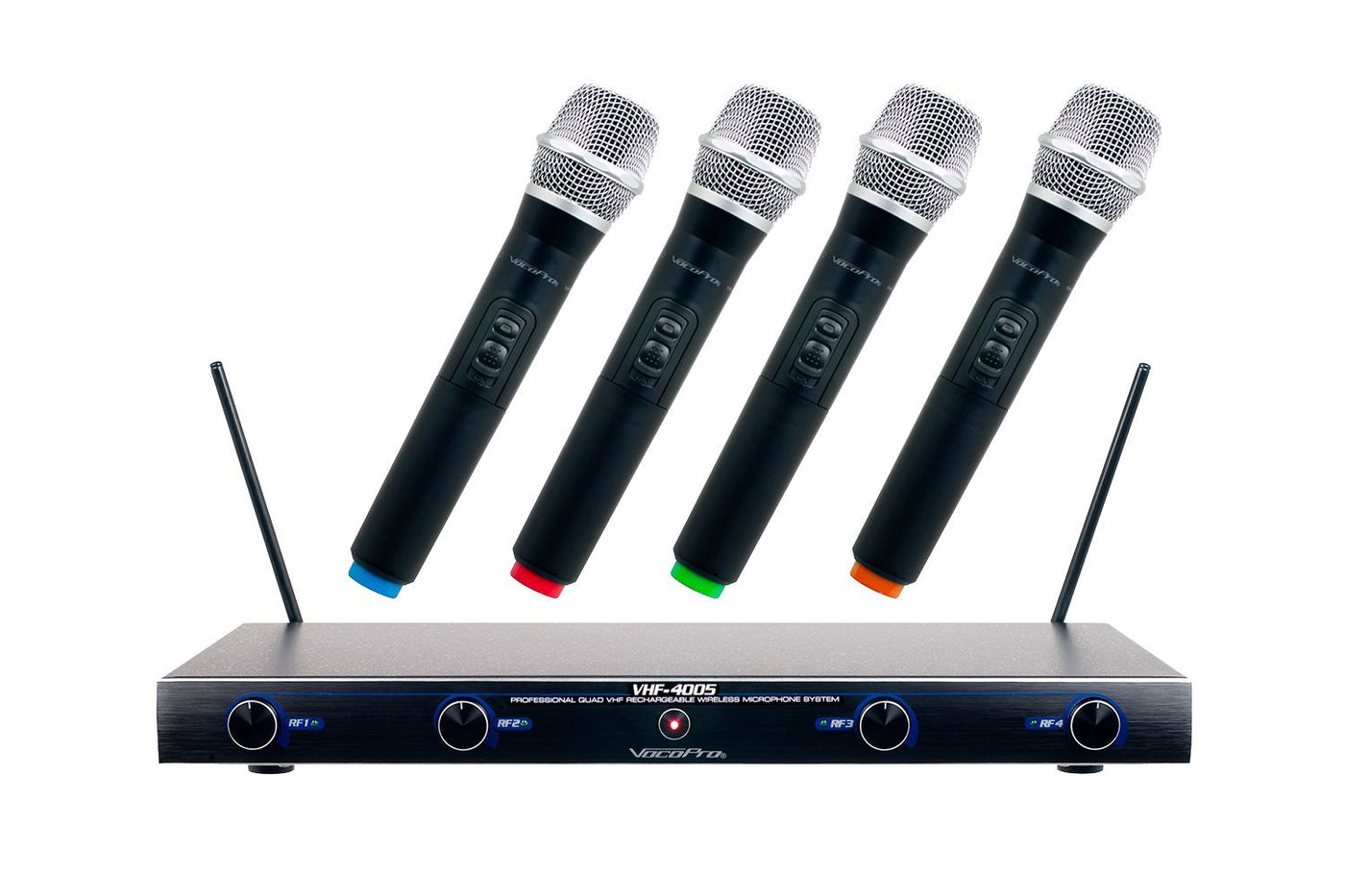- Q: What is included with the VocoPro VHF40052 microphone system? A: The VocoPro VHF40052 package includes the main receiver unit and four rechargeable handheld microphones.