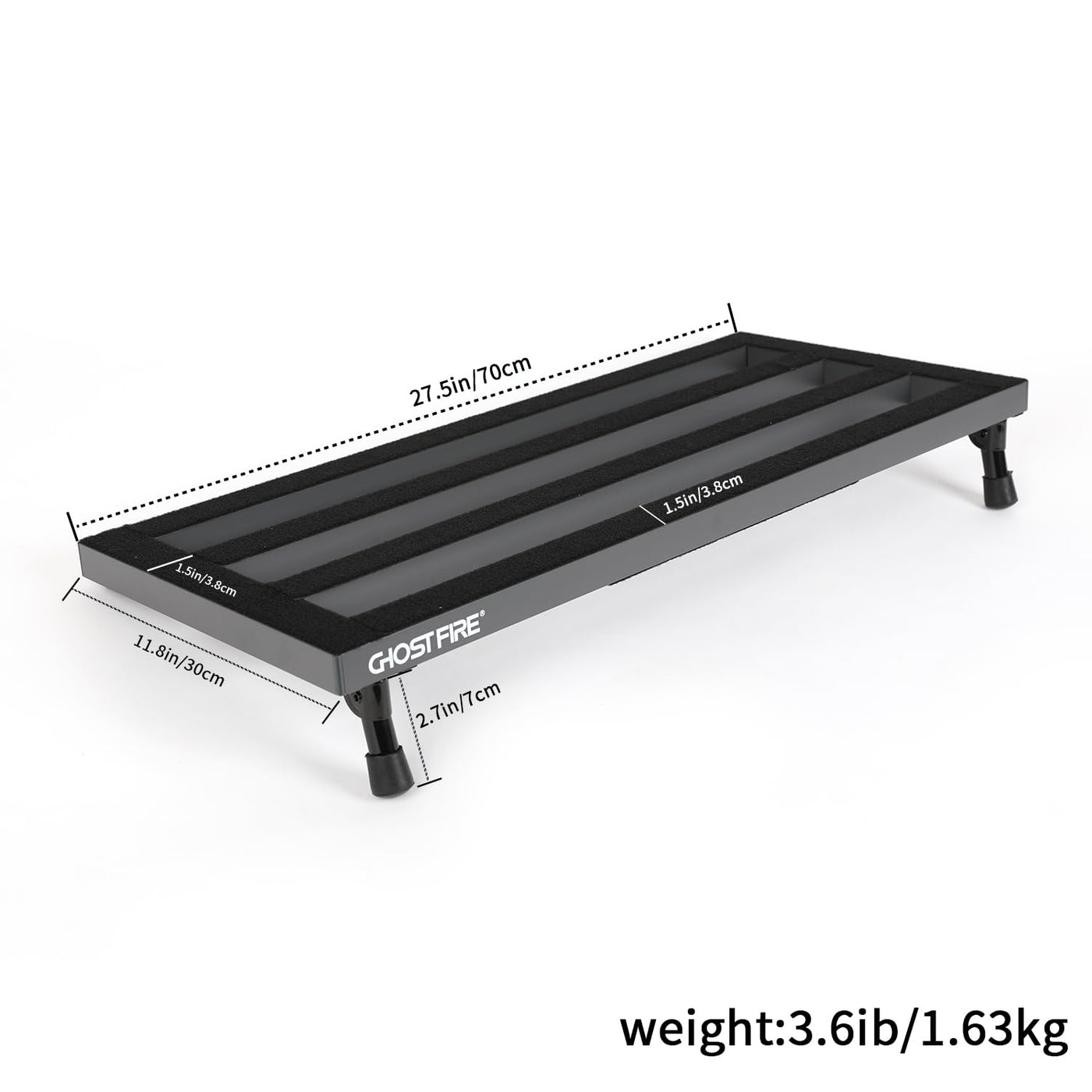- Q: What are the dimensions and weight of the Ghost Fire Guitar Pedal Board? A: The Ghost Fire Guitar Pedal Board measures 27.5'' x 11.8'' and weighs only 3.6 lbs.