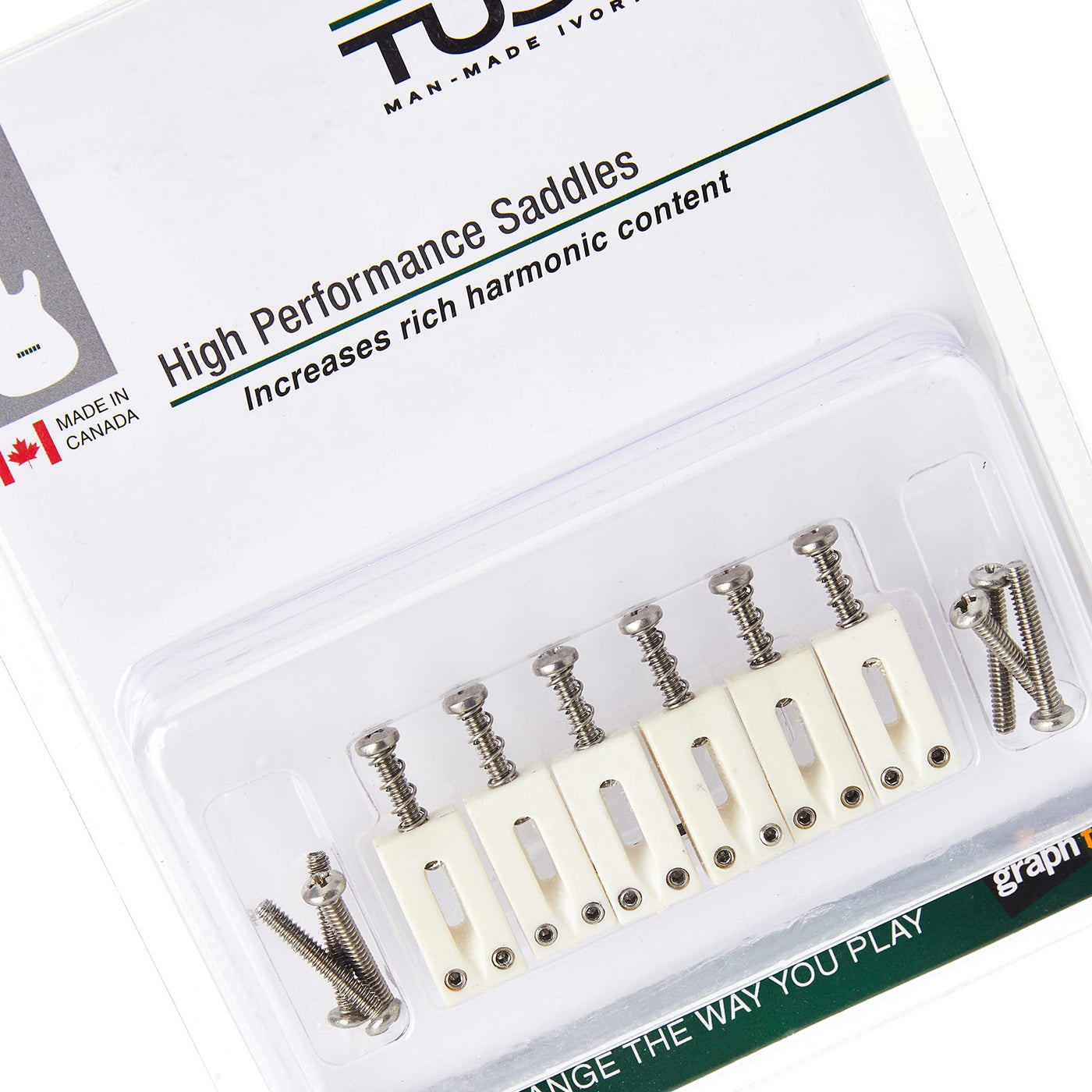 • Q: What are the benefits of using TUSQ saddles? A: TUSQ saddles are known for enhancing the tone of guitars. They help in transferring vibrations more efficiently to the guitar top, resulting in richer lows and clearer highs, making guitars sound more alive.