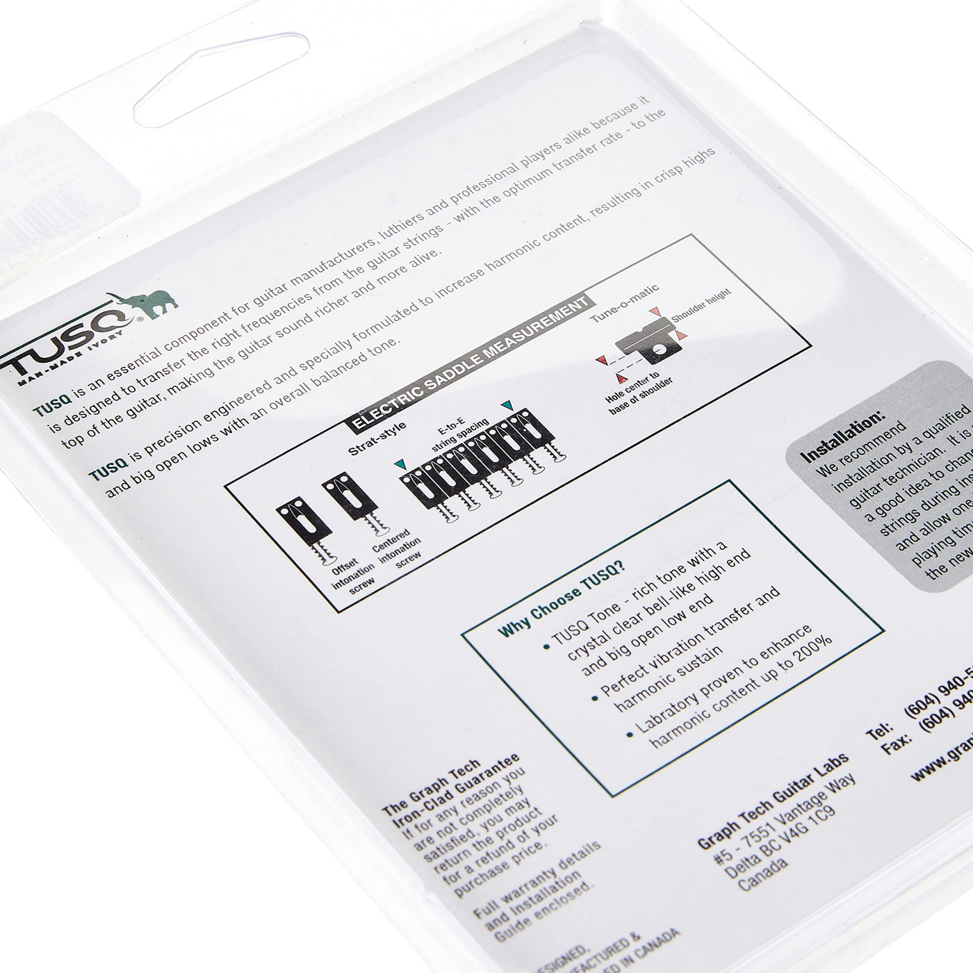 • Q: What materials are used in the Graphtech Guitar Saddle? A: The Graphtech Guitar Saddle is made from TUSQ, which is a synthetic material designed to mimic the tonal qualities of ivory while providing durability and improved sound quality.