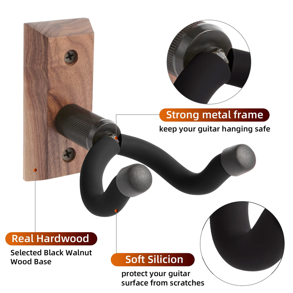 - Q: What materials are used in the construction of the guitar wall mount? A: The mount features a real hardwood black walnut base, along with metal and silicone rubber for enhanced durability and protection.