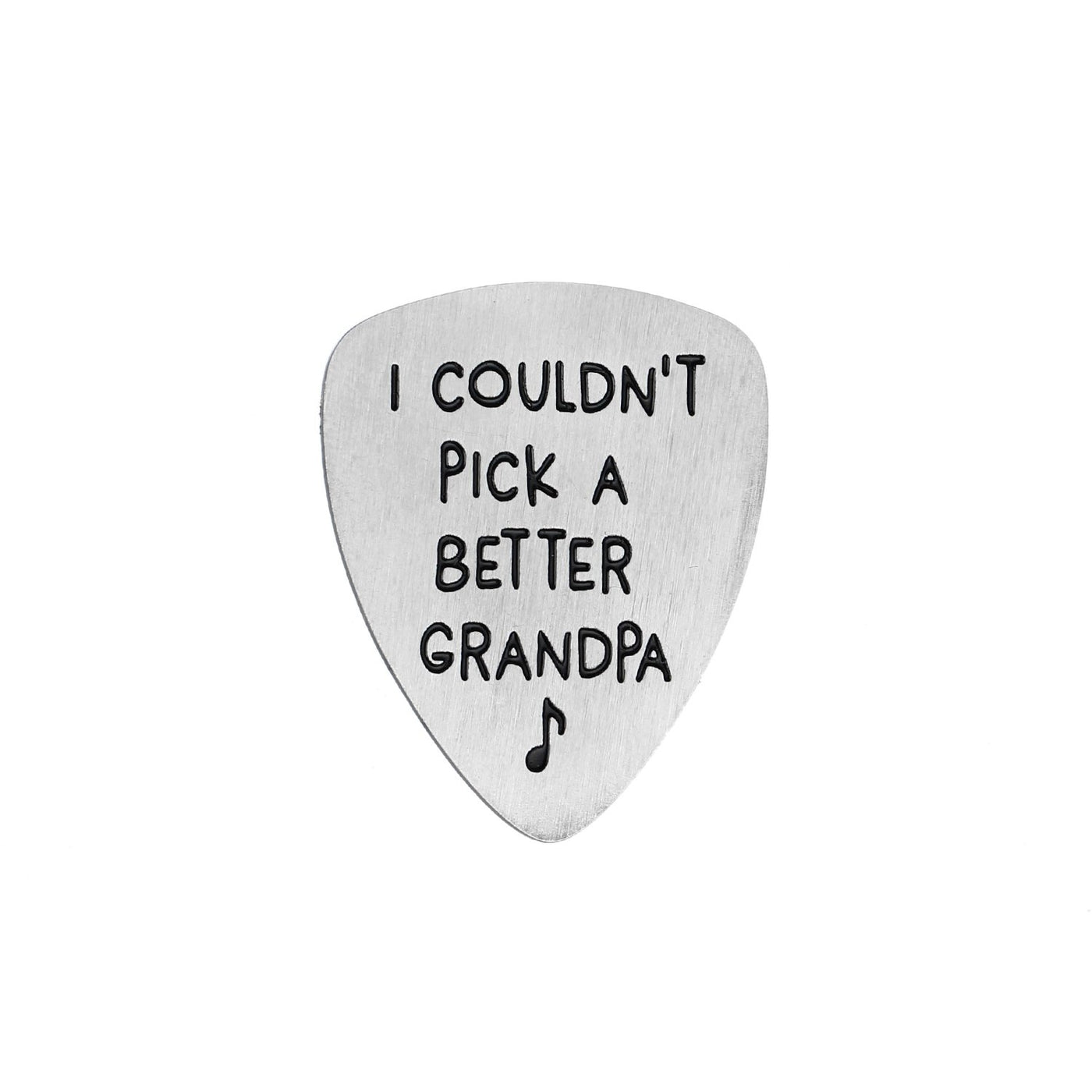 • Q: What does the engraving on the guitar pick say? A: 'I Couldn't Pick a Better Grandpa' is hand-stamped on the guitar pick.