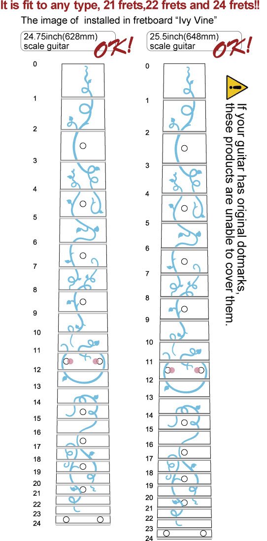 • Q: Will the Jockomo Ivy Vine Inlay Sticker hide existing dot marks on my guitar? A: No, the stickers are designed not to hide existing dot marks, allowing you to customize your instrument without completely covering them.