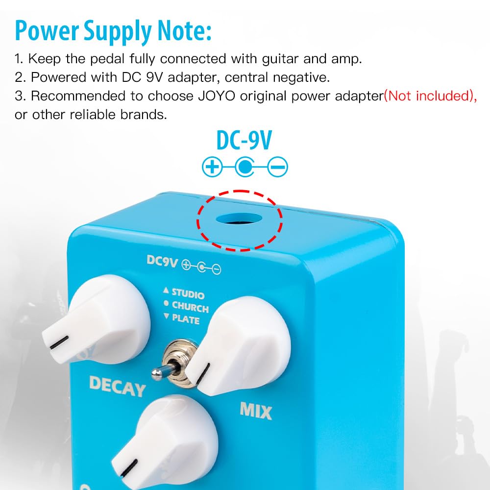- Q: What are the main features of the JOYO JF-20 Reverb Effect Pedal? A: The JOYO JF-20 Reverb Effect Pedal features three digital reverb effects: Studio, Church, and Plate. It has a true bypass design, a high-performance 32-bit DSP chip, and adjustable knobs for decay, mix, and tone.