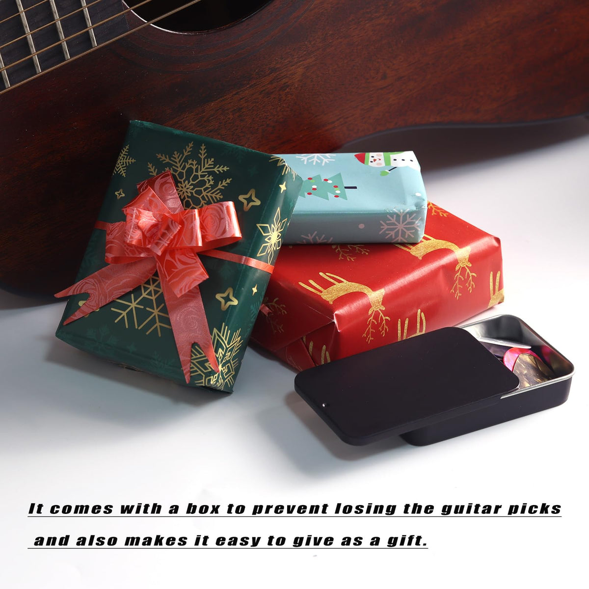 - Q: How does the guitar pick case work? A: The guitar pick case allows you to store and retrieve picks with one hand, preventing them from falling out.