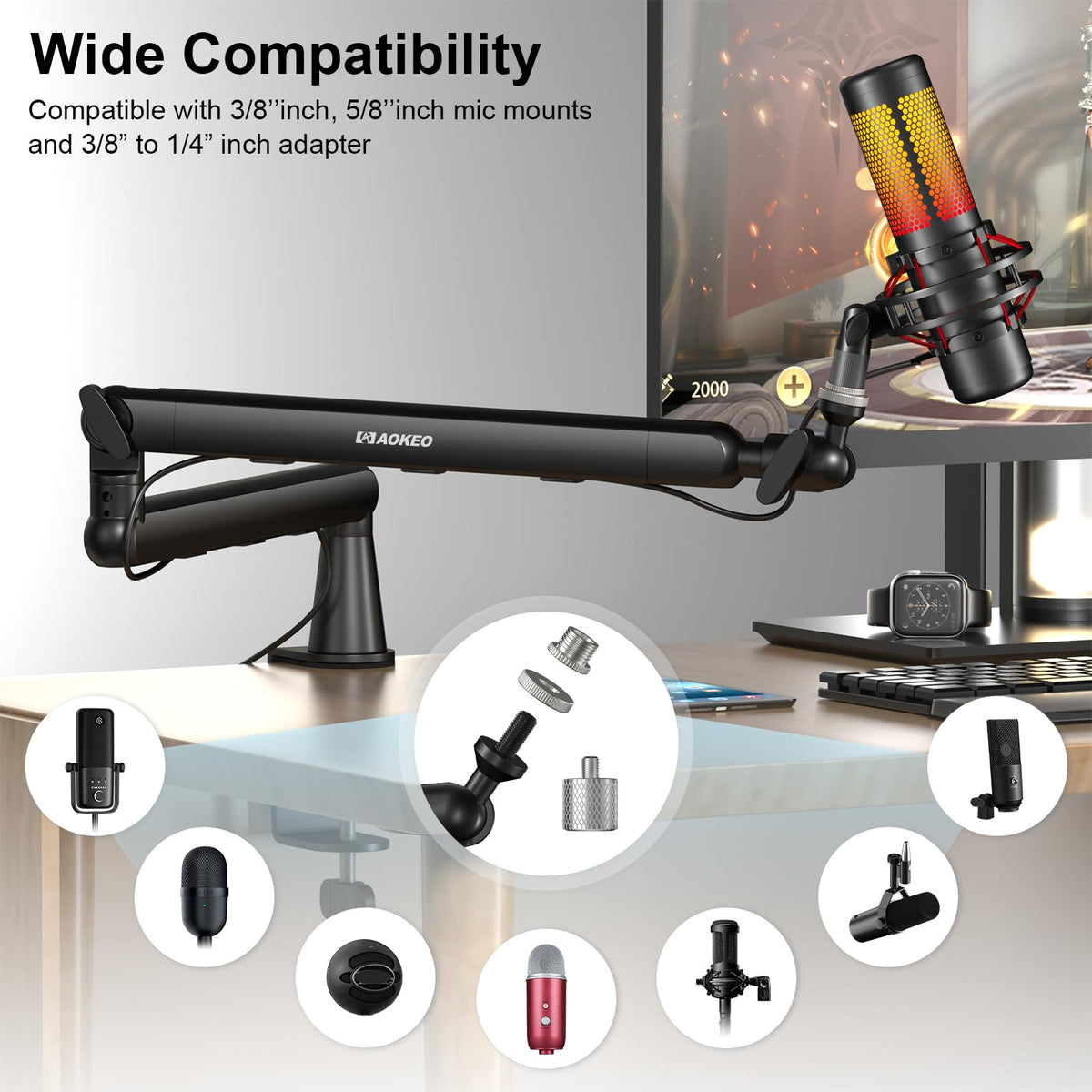 - Q: What microphones are compatible with the Aokeo AK-55 microphone arm? A: The Aokeo AK-55 microphone arm is compatible with a variety of microphones including Blue Yeti, Snowball iCE, HyperX QuadCast, SoloCast, and Elgato Wave, among others. It comes with adapters for versatile microphone attachment.
