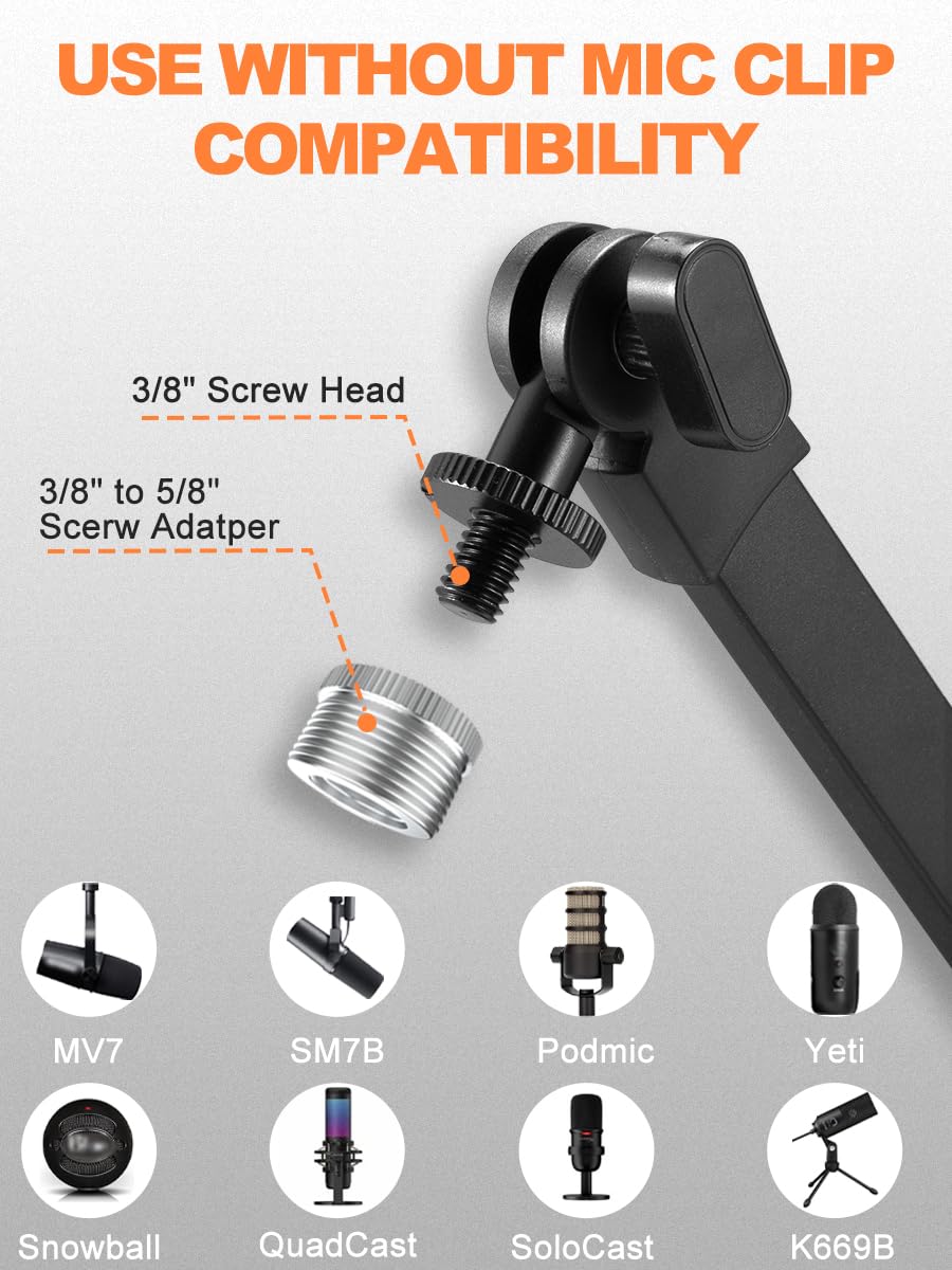 - Q: How does the 3/8" to 5/8" screw adapter work? A: The 3/8" to 5/8" screw adapter allows the Mictop boom arm to be compatible with a wide range of microphones, ensuring versatility in use.