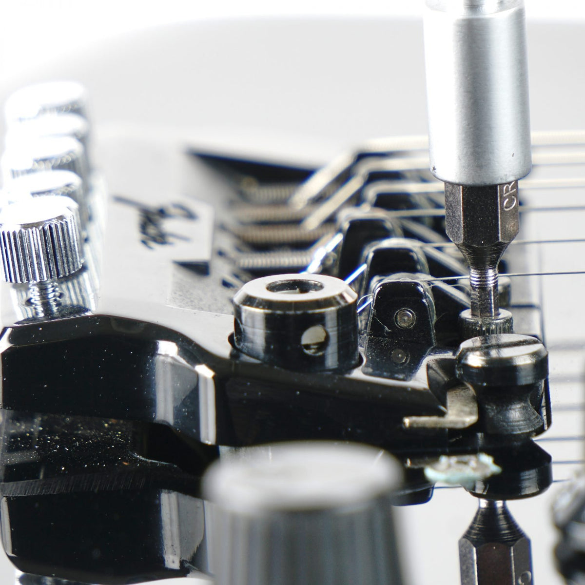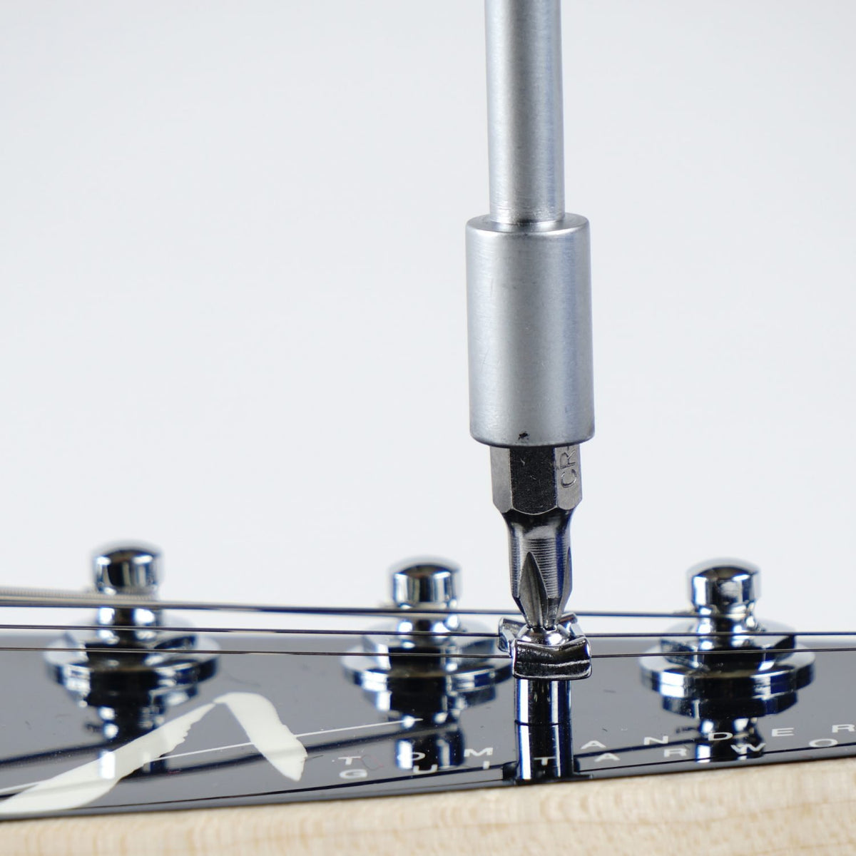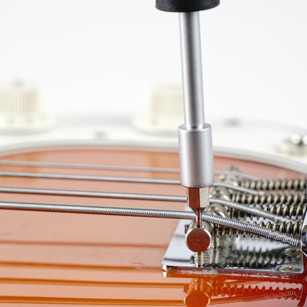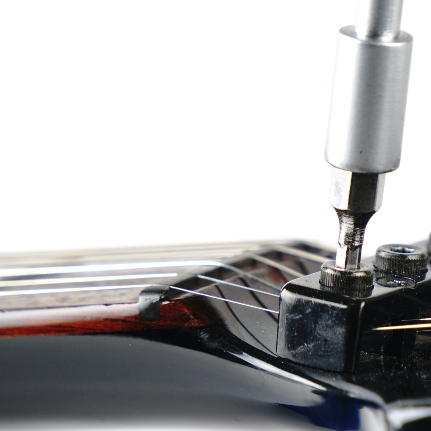 Forget lugging around screwdrivers, nut drivers, wrenches and Allen Keys or multiple bit sets in bulky cases, The Octopus 17 n 1 Tech Tool can handle every job! MusicNomads patent pending, innovative design is the perfect tool for tightening or loosening screws and hex nuts on vital gear components like bridges, saddles, locking nuts, output jacks, control pots, tuning machine bushings and more. Just say no to metal....tools that is! Our ergonomic handle is made from strong ballistic nylon material that wont scratch or ding your hardware and is engineered for the most popular Hex Wrench sizes : 10mm, 12mm, 14mm, 1/2 (2) & 7/16 . Our unique handle also holds the universal adapter giving you even more versatility. The metal universal adapter features a 7th 1/4 Hex Wrench for tightening or loosening hex nuts, in addition it securely holds our 10pc screwdriver bit set. Our screwdriver bit set features Phillips & flat head bits along with 8 Allen Key bits (.050'', 1/16'', 3/32'', 1.5mm, 2.0mm, 2.5mm ,3.0mm, 4.0mm) for nearly any kind of screw you may find on your gear. It tackles every job including precision adjustments to pieces like tremolo systems. Take out the universal adapter to utilize our 1/2 narrow profile Hex Wrench for tightening tough to reach sunken pots & tele cups. This little tool delivers big results and is a must have for every instrument case