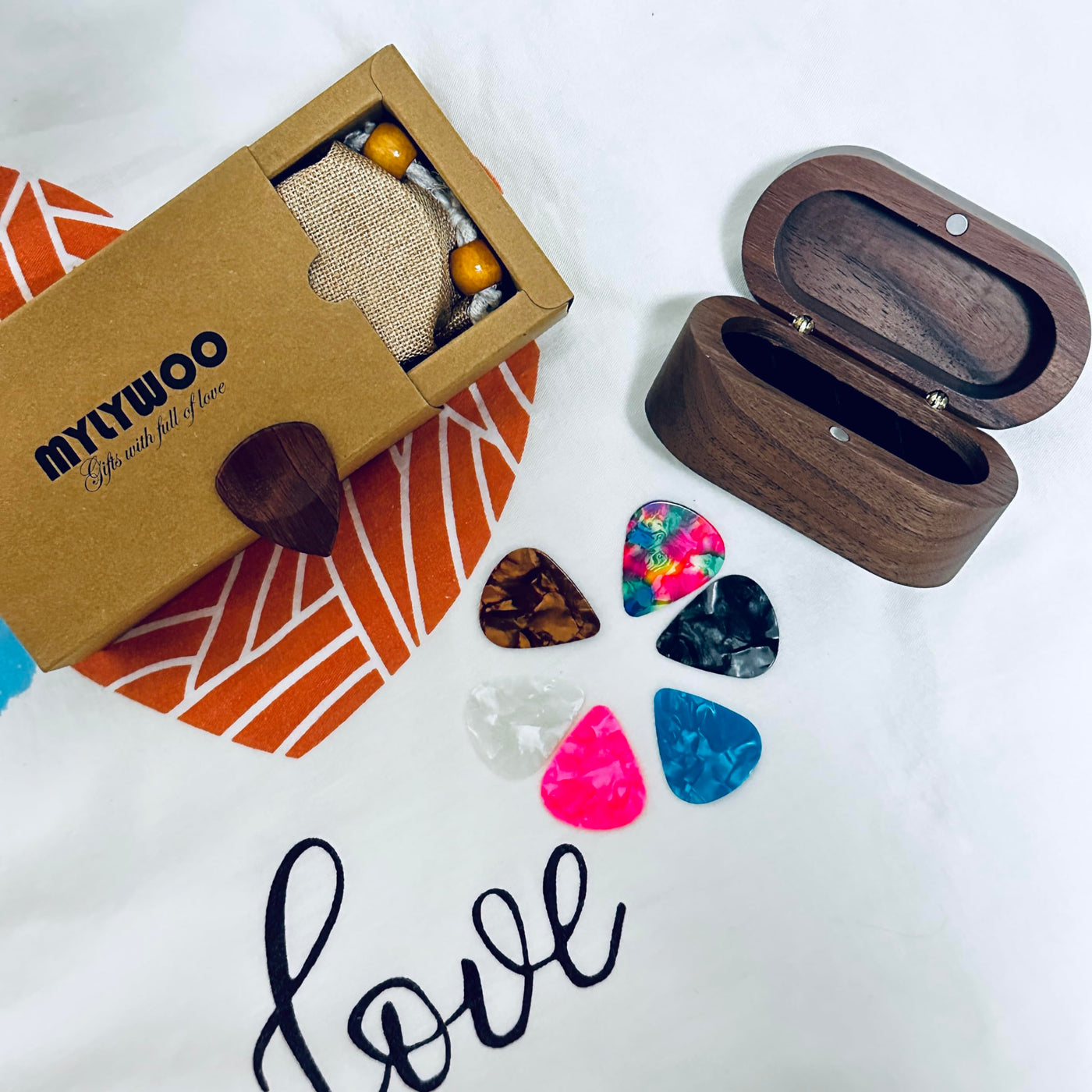 - Q: What materials are used in the MYLYWOO Guitar Pick Holder Set? A: The MYLYWOO Guitar Pick Holder Set is made from wood and celluloid. The box is crafted from walnut, while the picks include a rosewood pick and six celluloid picks.