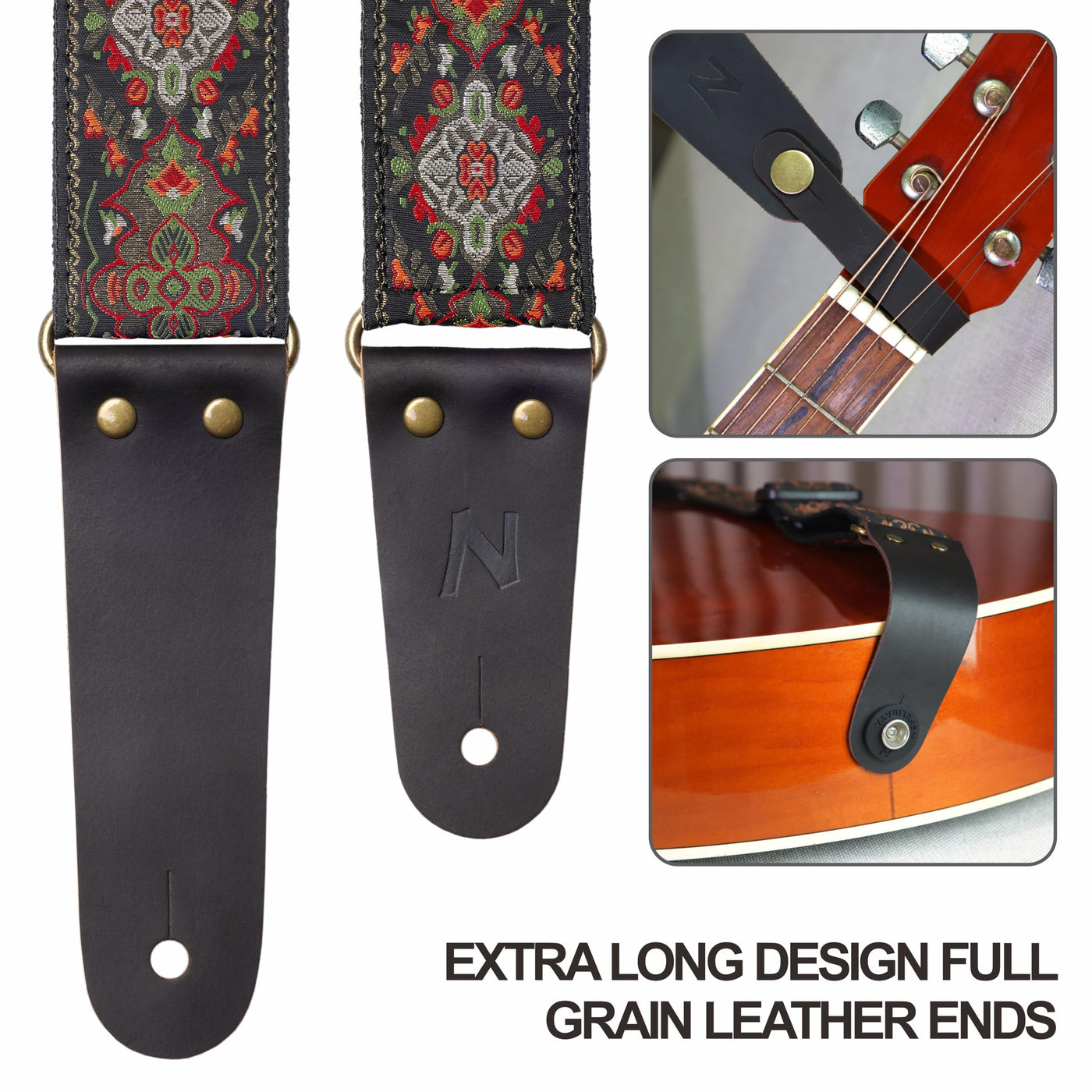 Nefelibata Guitar Strap, 2'' Embroidery Full Grain Leather Ends Guitar Straps with Hidden Pocket, for Bass, Electric and Acousti