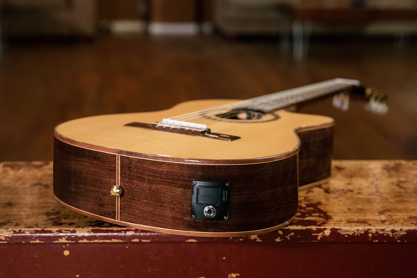 - Q: What materials are used in the construction of the Ortega RCE159MN? A: The Ortega RCE159MN features a solid North American cedar top, walnut back and sides, and a mahogany neck, providing a rich sound and aesthetic appeal.