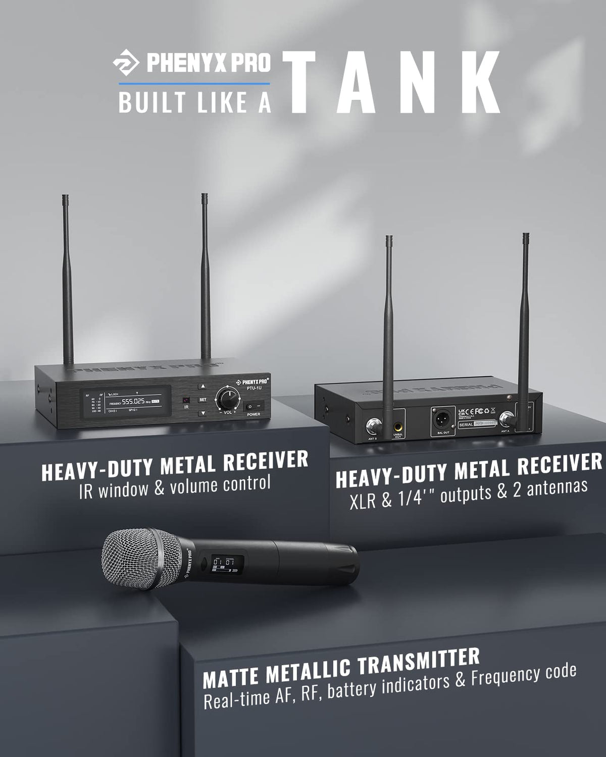 - Q: What materials are used in the construction of the microphone? A: The Phenyx Pro microphone features a heavy-duty all-metal housing for both the wireless receiver and the handheld microphone, ensuring durability and reliability.