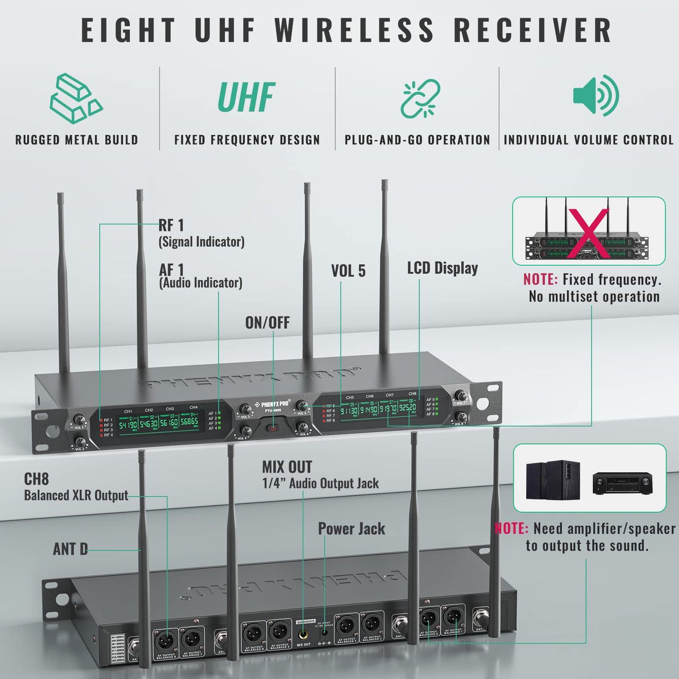 Phenyx Pro Wireless Microphone System, 8-Channel UHF Cordless Mic with Metal Handheld Wireless Mics, Fixed Frequency Dynamic Mic