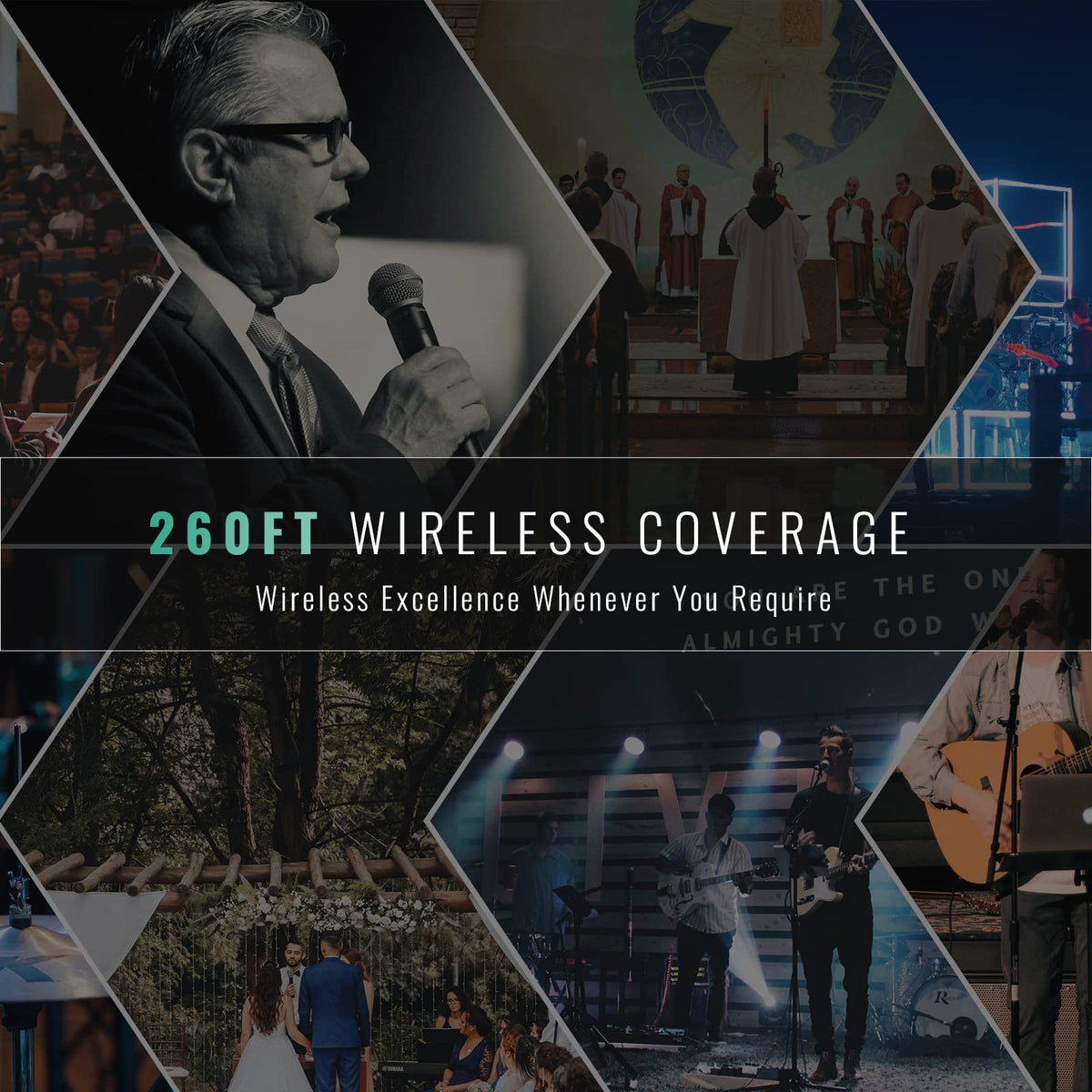 - Q: How far can the microphones operate effectively? A: The microphones can operate effectively up to a distance of 260 feet, providing reliable performance in wide open spaces.