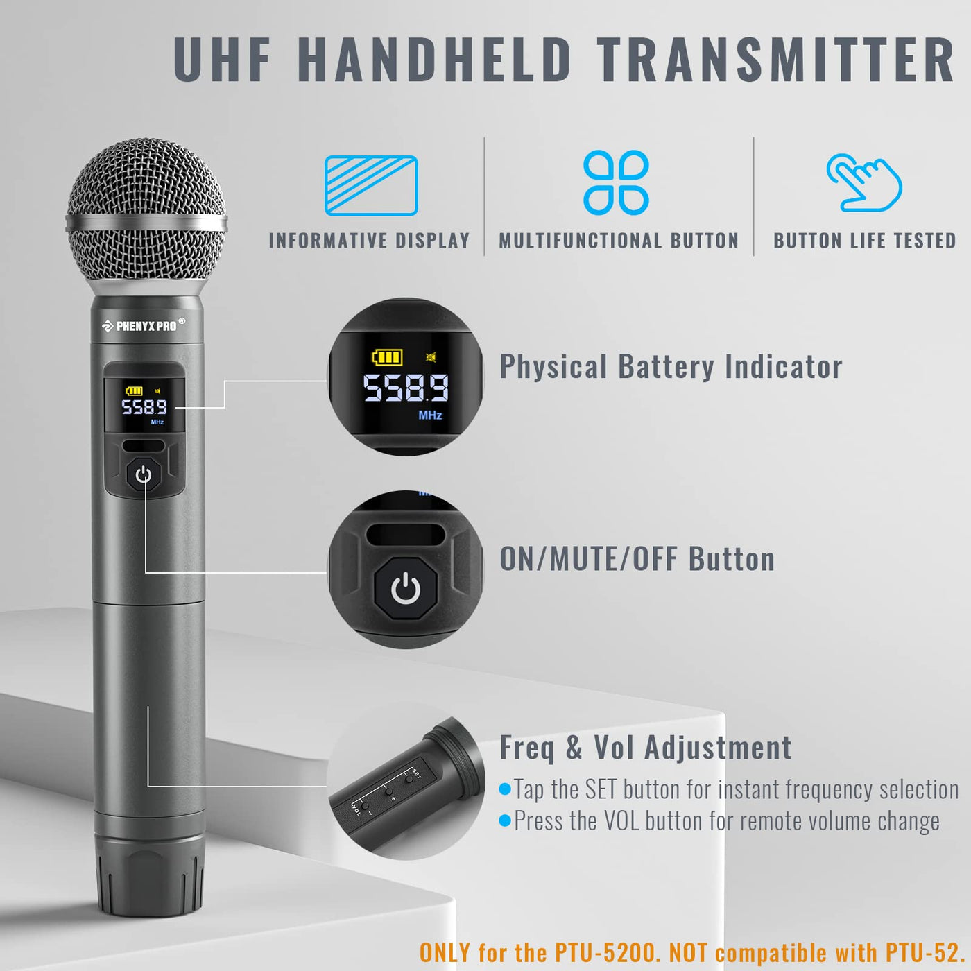 - Q: What are the frequency settings available for the microphones? A: The Phenyx Pro Wireless Microphone System features 4x25 UHF adjustable frequencies, allowing users to select the best frequency to avoid interference.