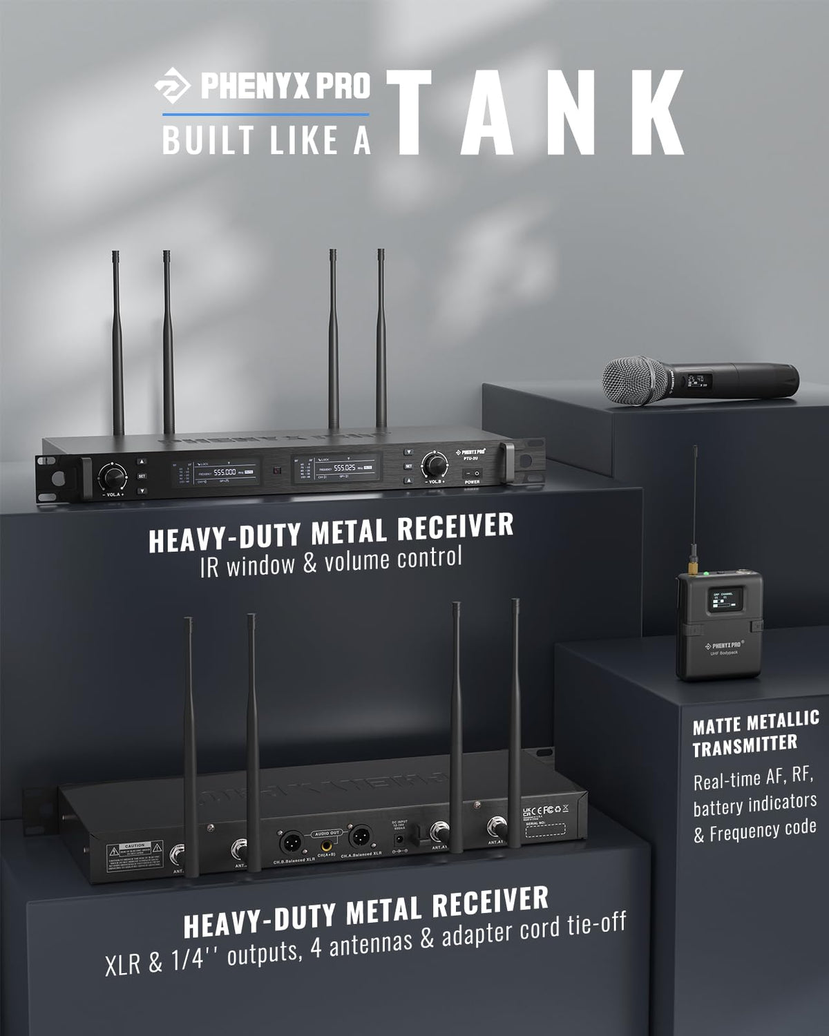 - Q: What materials are used in the construction of the microphones? A: The microphones and receiver are constructed with heavy-duty all-metal materials, ensuring durability and a professional look.
