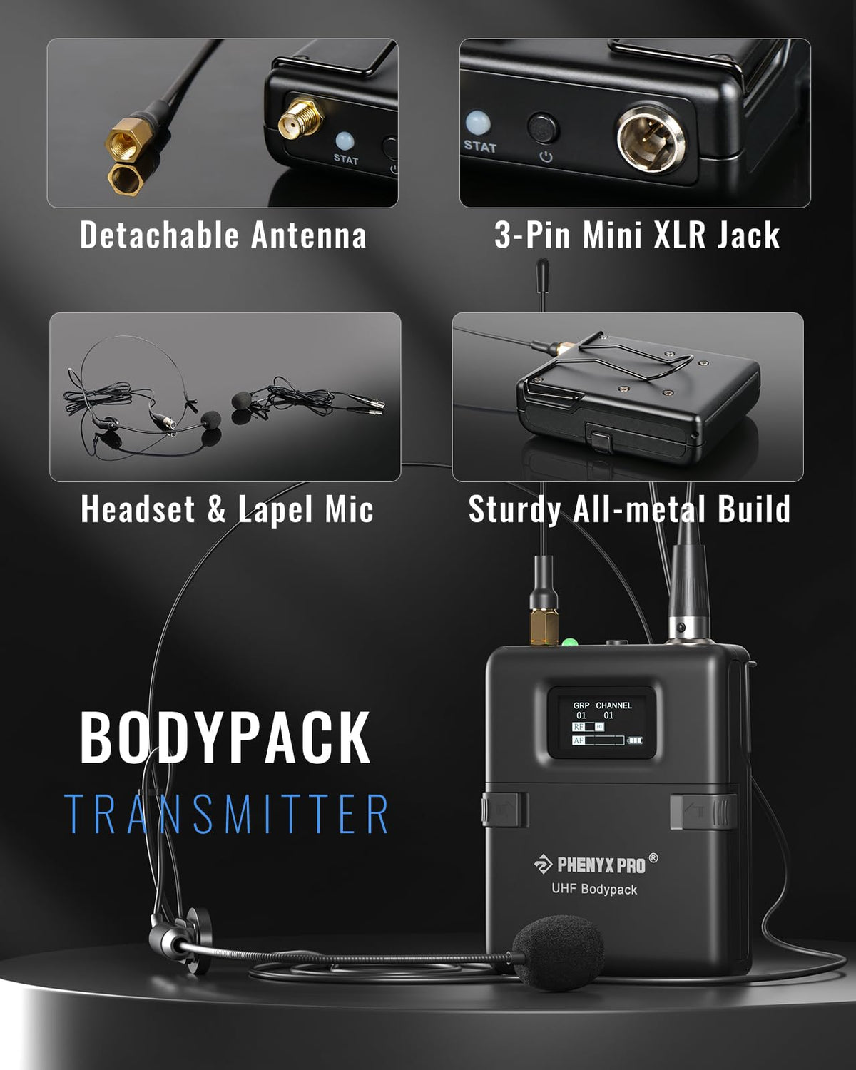 - Q: What is included in the Phenyx Pro Wireless Microphone System package? A: The package includes a dual-channel wireless metal receiver, a UHF handheld dynamic microphone, a UHF bodypack wireless transmitter, a black lapel lavalier microphone, a black headset microphone, four antennas, a 1/4-inch audio cable, a 6.35mm to 3.5mm adapter, a power adapter, an anti-rolling ring, four AA batteries for 16 hours of use, and a user manual.