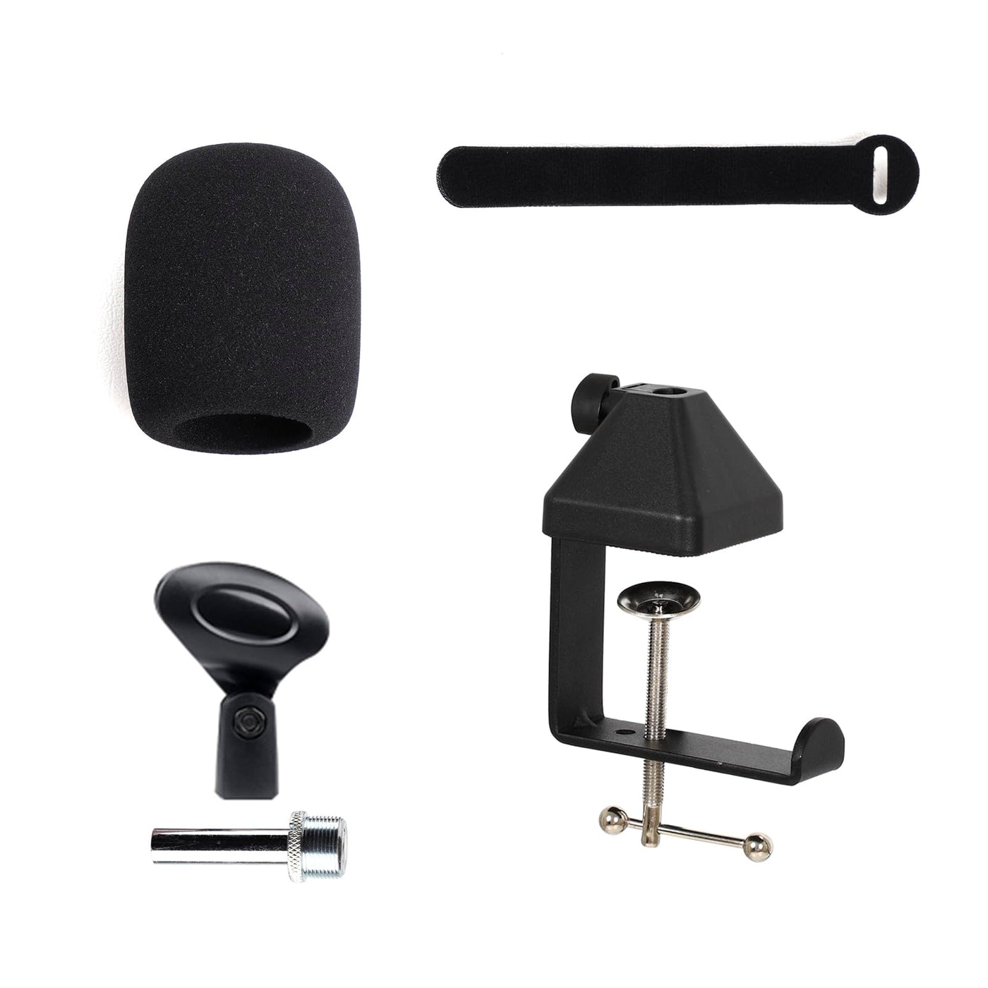 - Q: What comes included in the package of the Cicano Microphone Stand? A: The package includes a boom arm, desk clamp, mic clip, 3/8" to 5/8" adapter, pop filter, foam cover, four cable ties, and a manual.