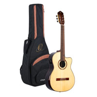 - Q: What are the main features of the Ortega Guitars 6 String Private Room guitar? A: The Ortega Guitars 6 String Private Room features a solid Alaska spruce top, AAA striped ebony back and sides, a mahogany neck, and an Indian laurel fretboard. It includes a Venetian cutaway design, Ortega MagusPro preamp/pickup system with a built-in tuner, and a contoured armrest for enhanced playability.