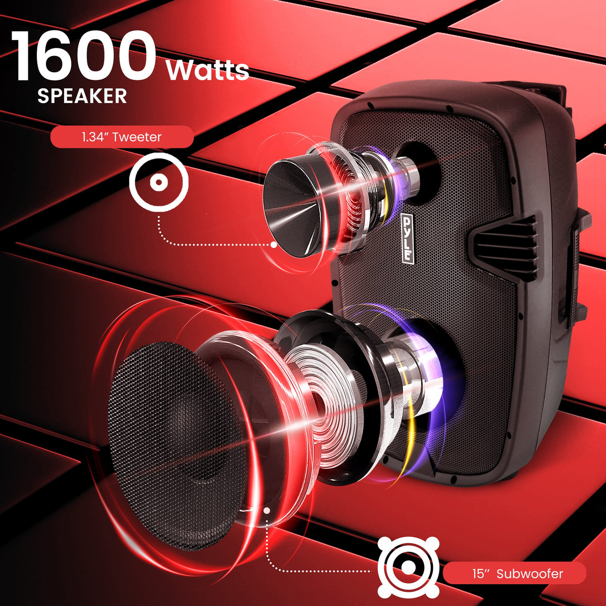 Pyle 1600 Watt, 15'' Bluetooth PA Speaker-Indoor/Outdoor Portable Sound System with (2) UHF Wireless Microphones Rechargeable Ba