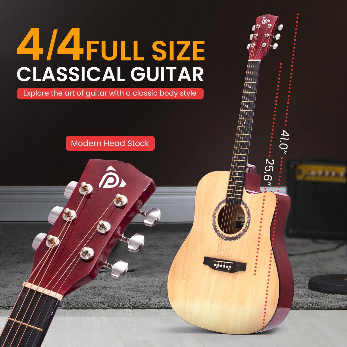 - Q: What is the total length of the guitar? A: The total length of the Pyle Beginner Cutaway Acoustic Guitar is 41 inches.