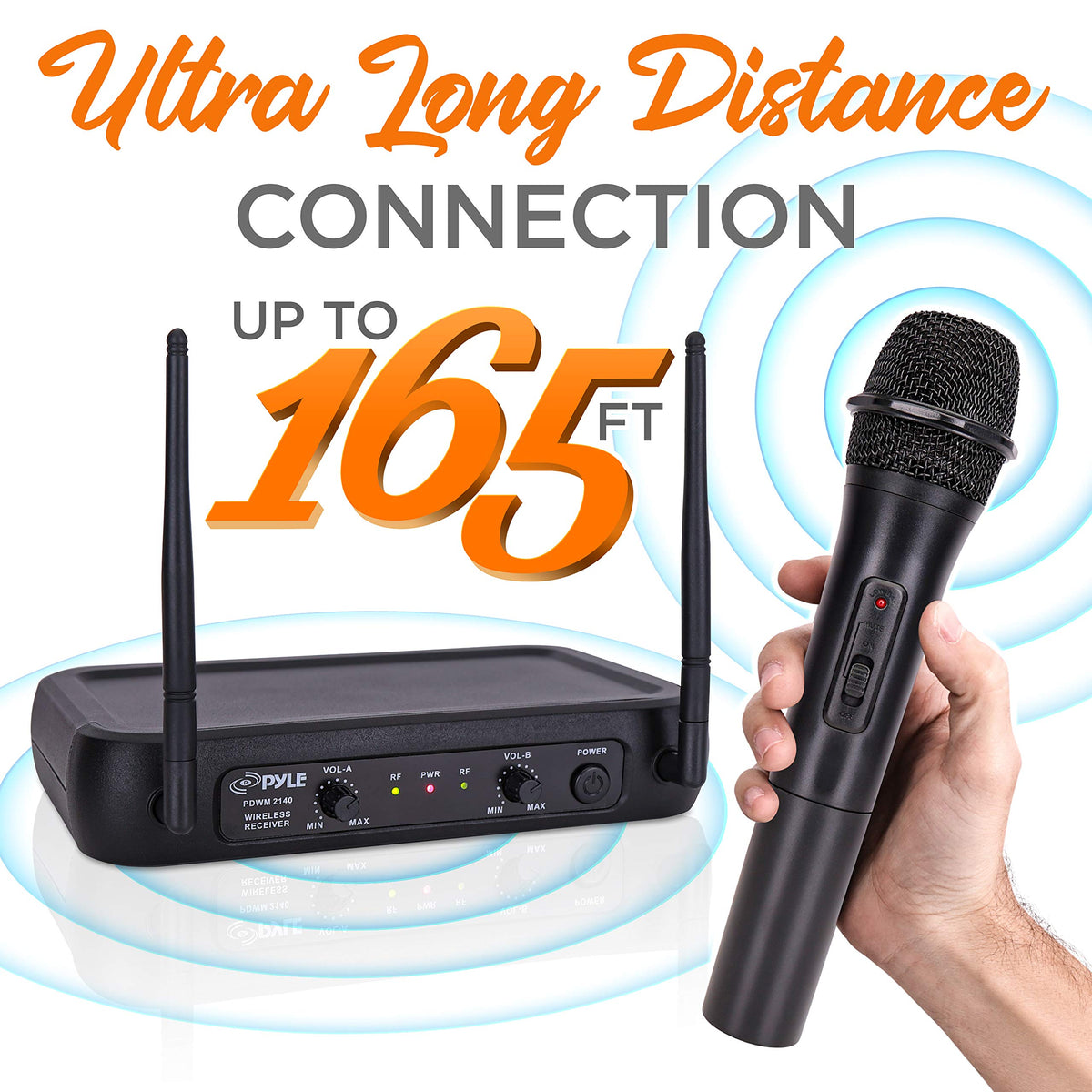- Q: What is the maximum range of the PYLE PDWM2140 wireless system? A: The maximum range of the PYLE PDWM2140 wireless system is not explicitly stated, but it is designed for clear sound transmission over considerable distances without interference.