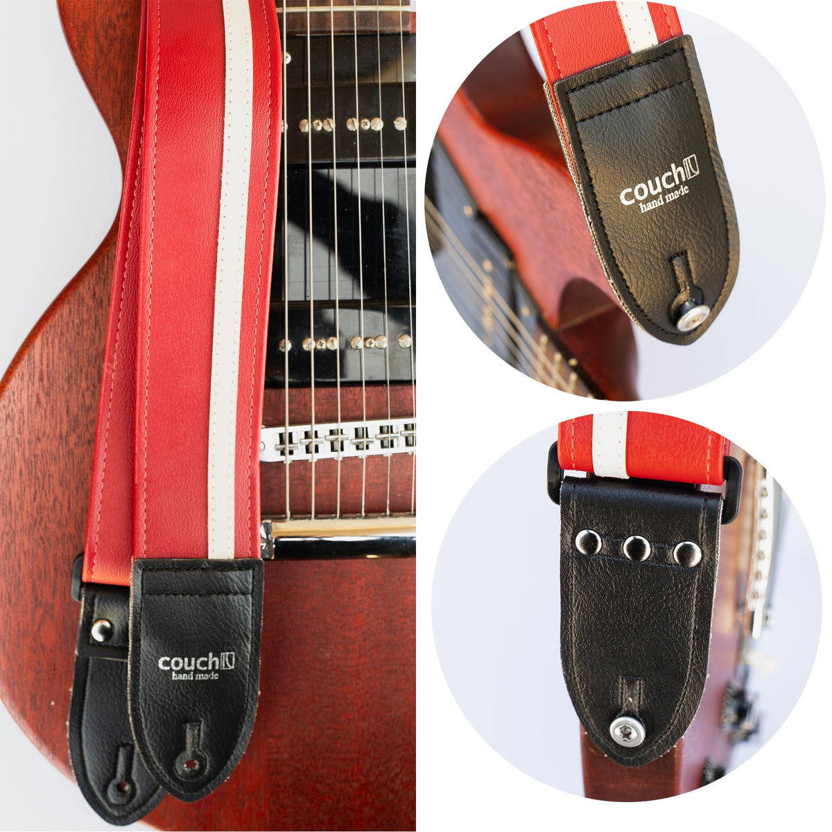 - Q: How is the strap secured to the guitar? A: The strap features end tabs made of three layers of durable materials, secured with three hand-tooled stainless steel rivets to ensure a strong connection to your guitar.