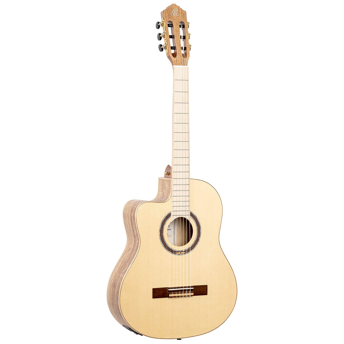 • Q: What features enhance playability on the Ortega TZSM-3-L? A: The guitar features a slim neck design with a curved fretboard radius of 400 mm (12 inches) and a Spanish heel construction, making it comfortable to play.