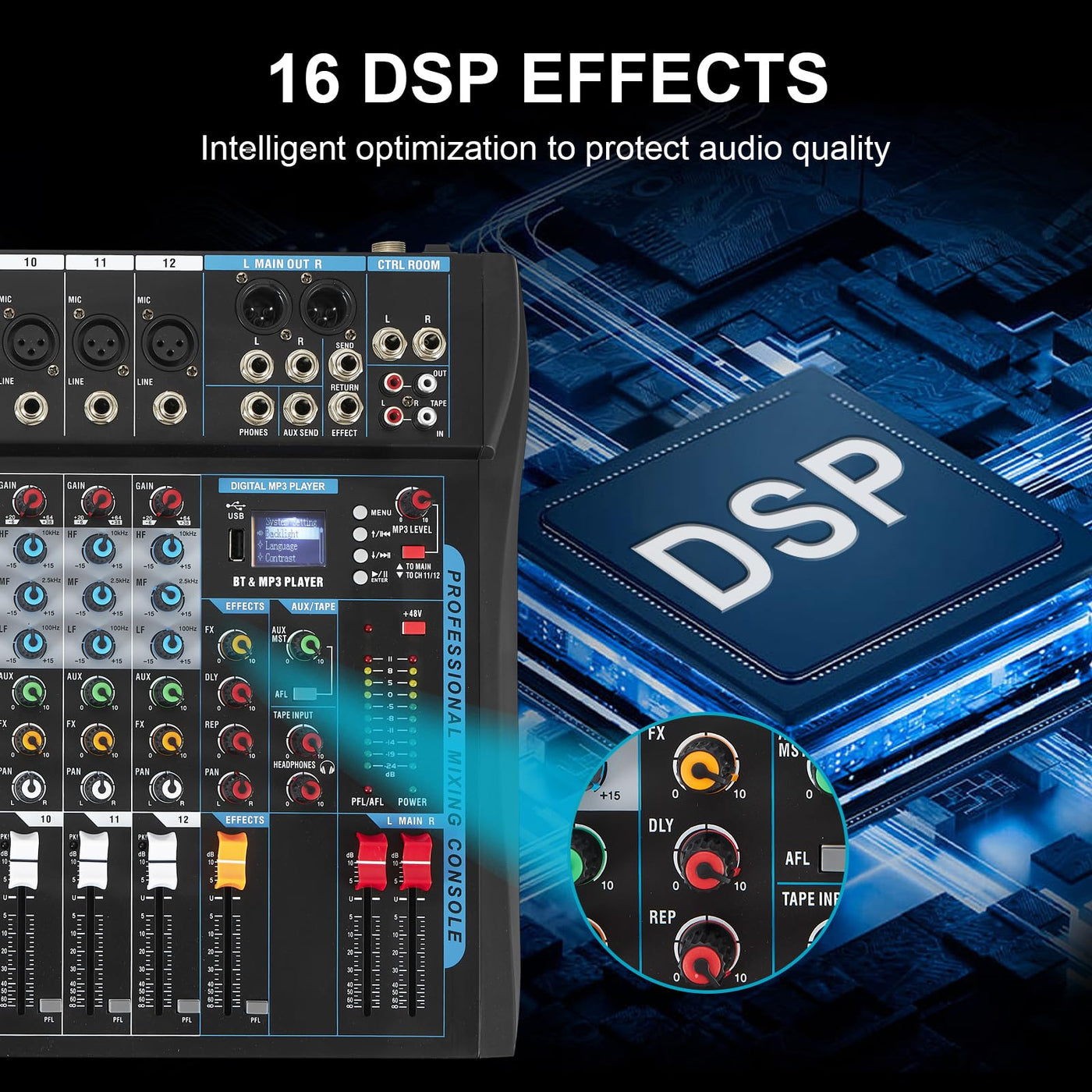 SIKUING 12 Channel Audio Interfacer Sound Board Mixer DJ Mixer 16-Bit DSP Effect USB Audio Mixer +48V Phantom Power Bluetooth Mi