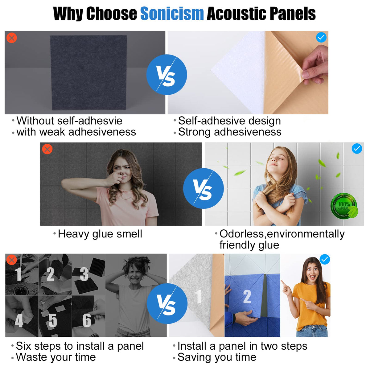 - Q: How do I install the Sonicism Acoustic Wall Panels? A: These panels come with a self-adhesive backing, making installation easy. Simply peel off the backing and stick them to the desired wall surface.