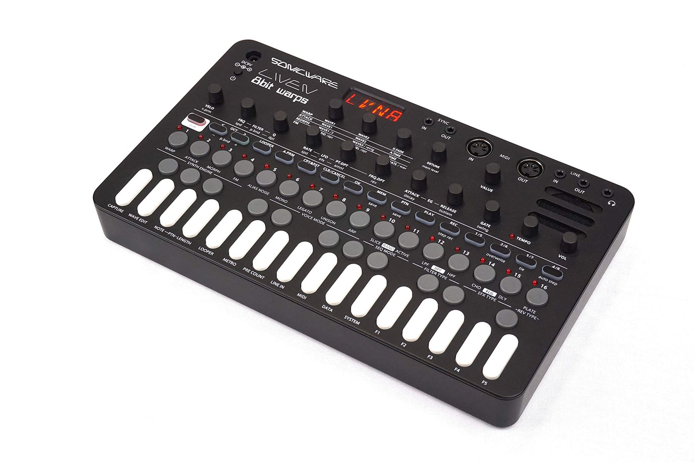 LIVEN 8bit warps is a synthesizer with machine-live-focused functions, four types of 8bit waveform memory synth engines, and a step sequencer It allows you to create a wide variety of sounds using carefully selected preset waveforms, editable user waveforms, and high quality filters and effects Use the unique 8-bit sounds of LIVEN 8bit warps not only for classic retro game sounds, but also for EDM, HipHop, techno, rock, and many other genres of music With 16 physical control knobs, a step-by-step parameter lock function, looper, live-specific effects, and a rich interface that facilitates synchronized performance with external devices, LIVEN 8bit warps is equipped with powerful features for live machine performance Specifications] -Sound source: 8-bit waveform memory engine -Maximum number of simultaneous sounds: 6 -Patch memory: 128 patch memory-Waveform memory: 128 waveform memories -Sequencer: Up to 128 steps, 128 patterns can be stored -Looper: 4 track looper (3 tracks for internal sound recording, 1 track for LINE IN recording) -Inputoutput terminals: MIDI INOUT (DIN type), SYNc INOUT (35 mm mini jack), LINE INOUT (35 mm stereo mini jack), headphone out (35 mm stereo mini jack) -Power source: AA batteries x 6 pcs or Dc9V output Ac adapter (over 1A, EIAJ3 standard 17mm inner diameter, 475mm outer diameter, center + ) -Exterior dimensions (W x D x H): 297 x 176 x 48 mm -Weight: approx 790 g