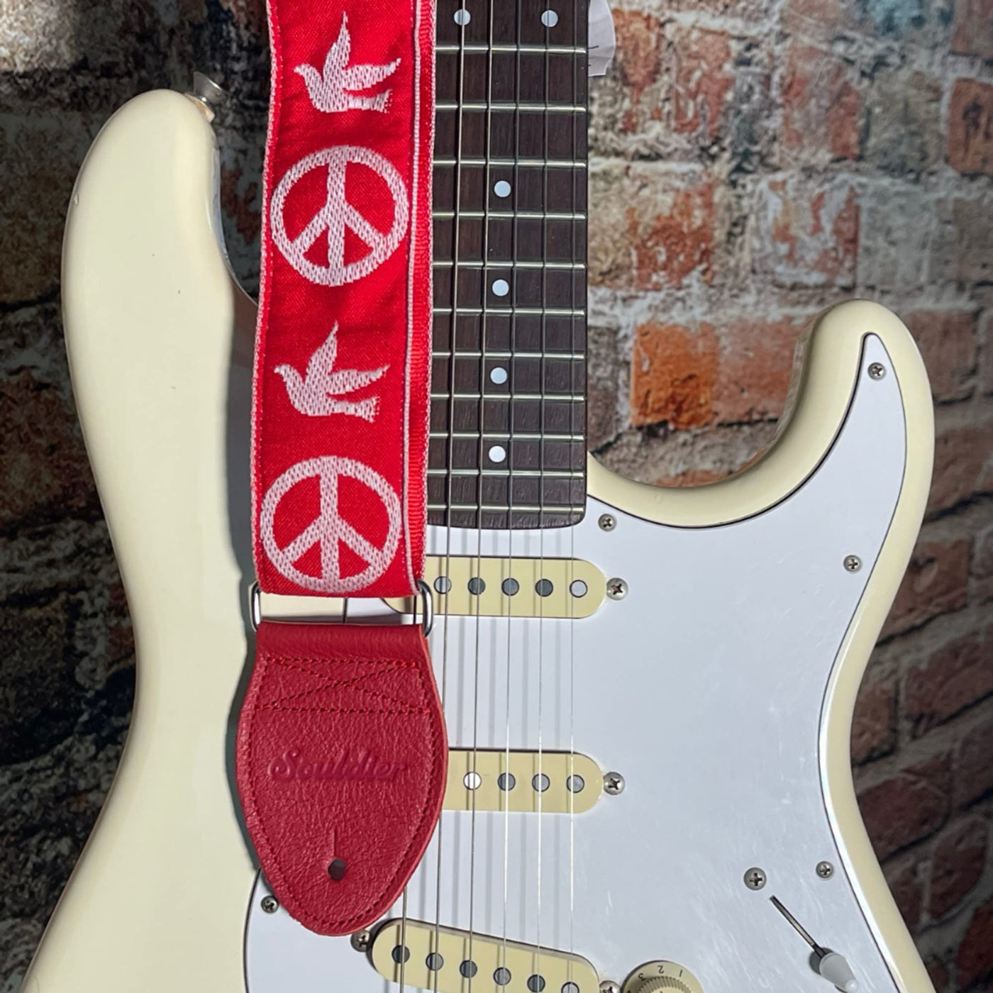 - Q: What materials are used in the Souldier GS1026RD02RD guitar strap? A: The Souldier GS1026RD02RD guitar strap is made from recycled seatbelts, vinyl, and features hand-cut leather ends.