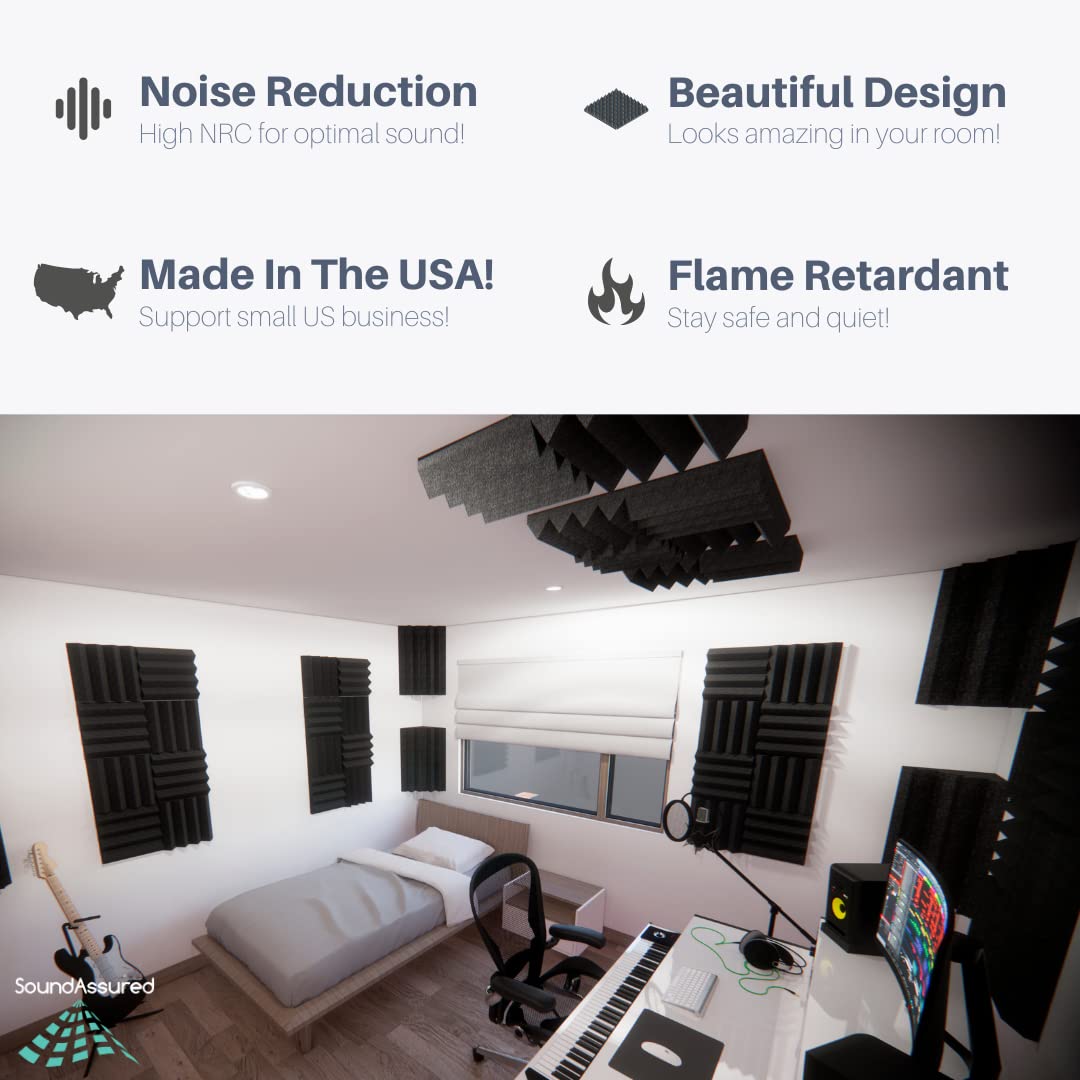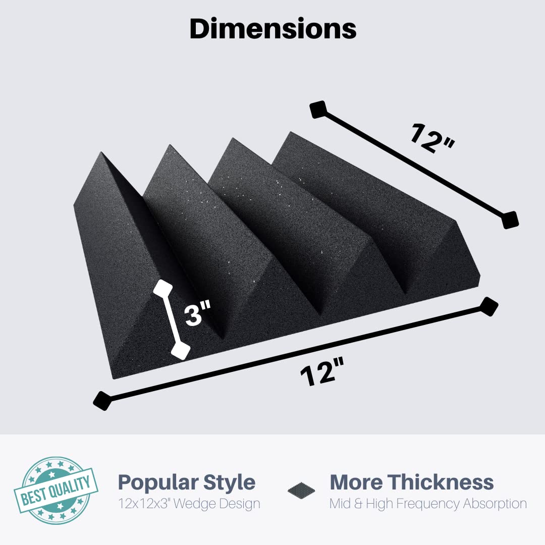 Soundproofing Acoustic Studio Foam - Bass Absorbing Wedge Style Panels 2 Pack 12in x 12in x 3 Inch Thick Tiles (Charcoal)
