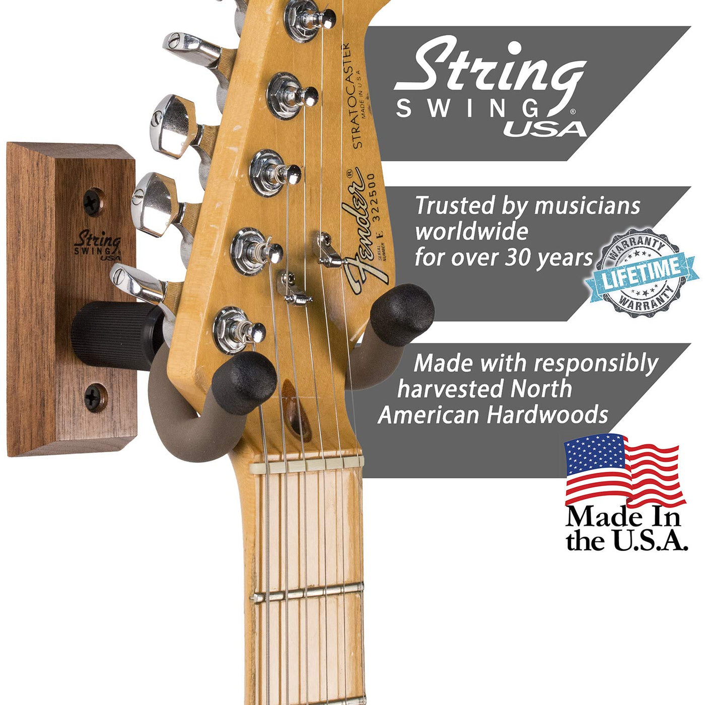 - Q: What materials are used in the construction of the hanger? A: The String Swing guitar hanger is made from real American hardwood, ensuring durability and stability. It is also 100% made in the USA, reflecting high-quality craftsmanship.