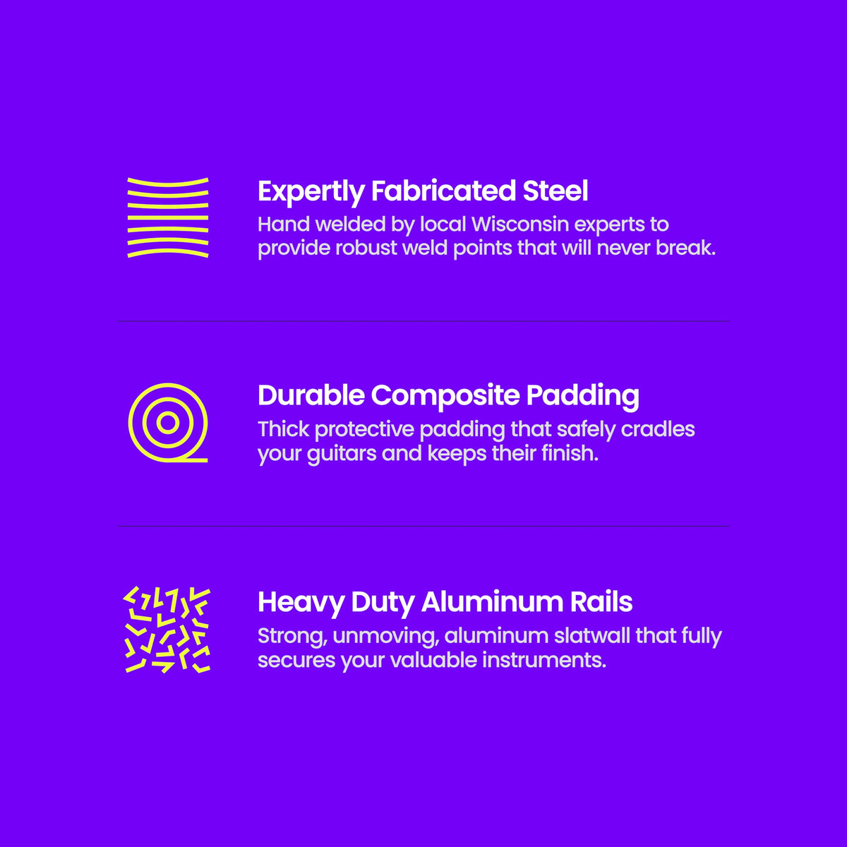 - Q: How does the rack help save space in my music room? A: By mounting guitars on the wall, the rack clears up floor space that would otherwise be occupied by traditional stands, creating a more organized environment.