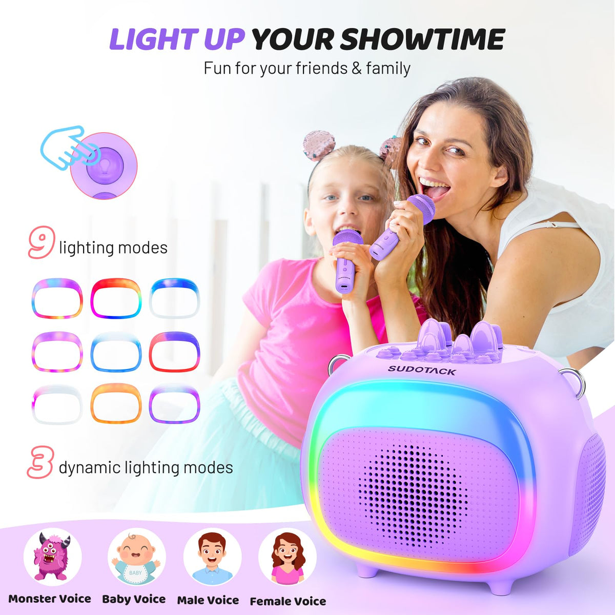 - Q: What are the key features of the SUDOTACK karaoke machine? A: Key features include 25W high power sound with deep bass, easy connection options, nine LED lighting effects, brightness adjustments, and five fun audio sound effects for the microphones.