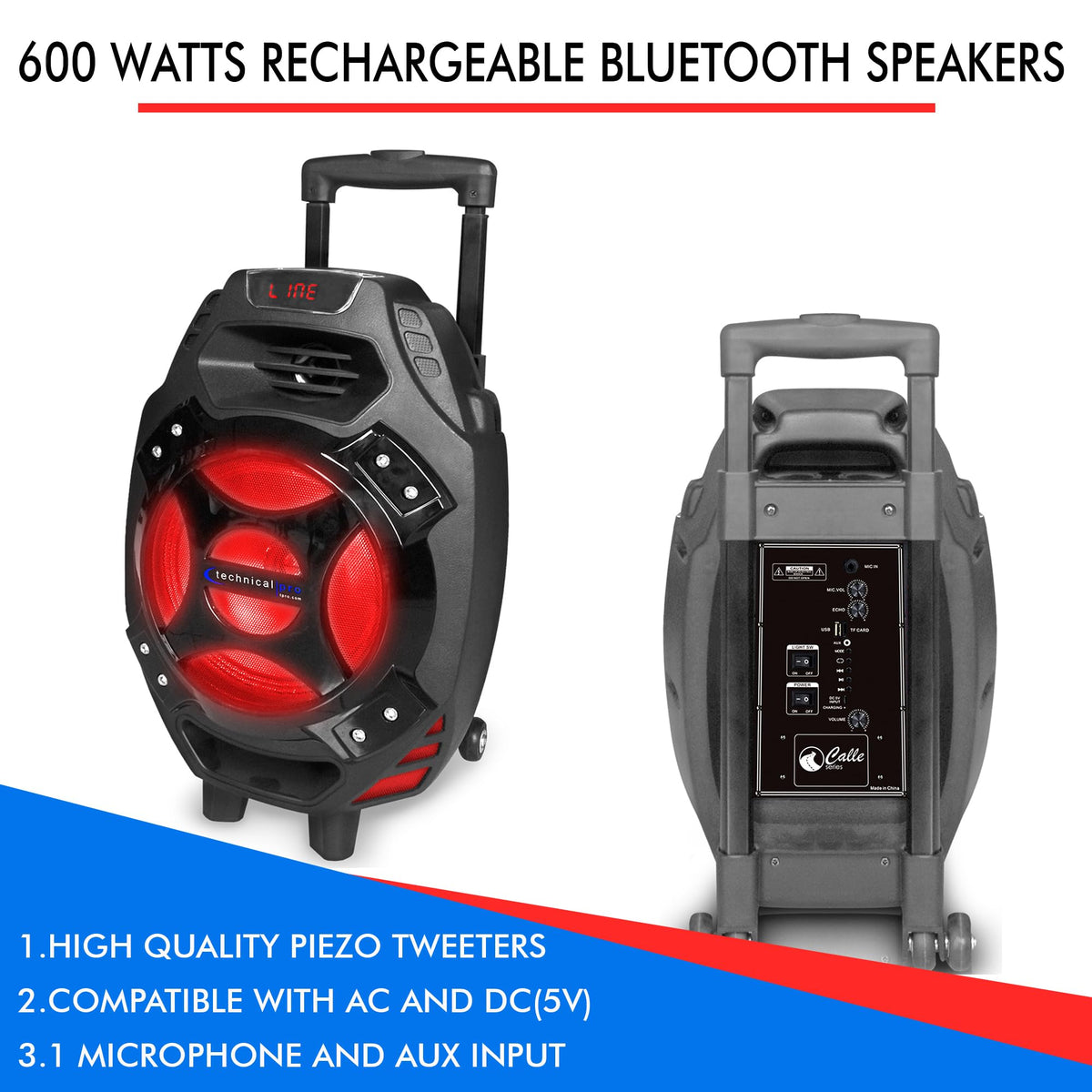 Technical Pro 600 Watts Rechargeable Bluetooth Speakers with Built-in Battery, USB, Mic, Aux and SD Card Inputs Portable LED Spe