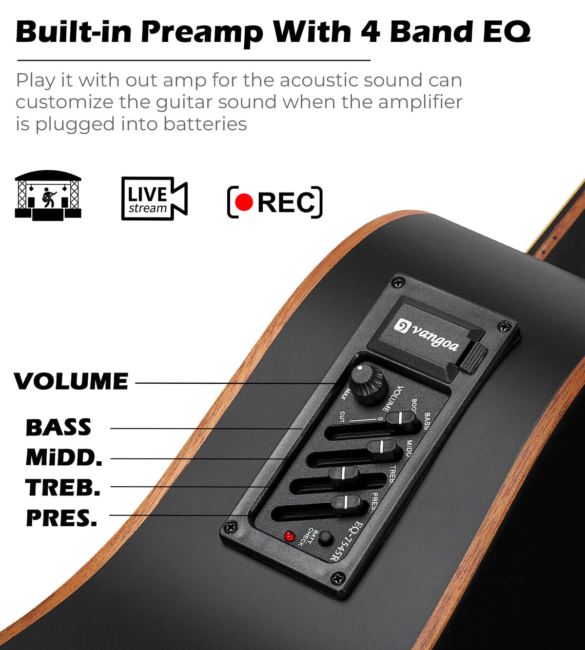 - Q: How does the built-in EQ enhance the playing experience? A: The built-in 4-band EQ allows players to adjust the bass, midrange, treble, and overall volume, which enables customization of the sound during performances or recordings.