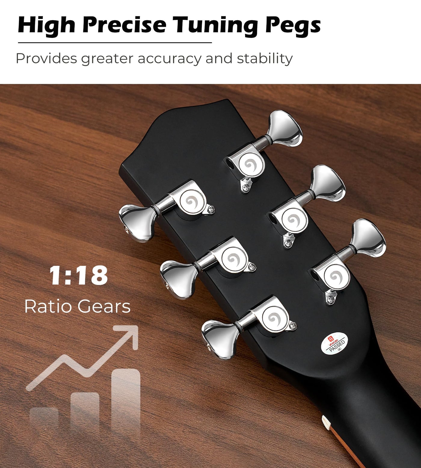 - Q: How do the tuning pegs affect tuning stability? A: The guitar is equipped with heavy-duty nickel tuning pegs that have a 1:18 gear ratio, providing finer adjustments and greater stability, which helps the guitar maintain its tuning longer.