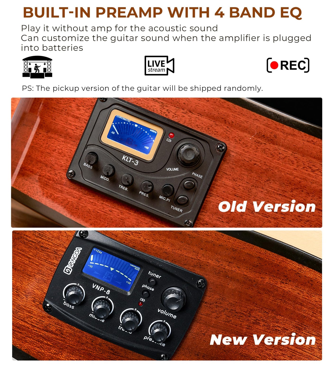 - Q: Can I play this guitar without an amplifier? A: Yes, the Vangoa Electric Acoustic Guitar can be played as a traditional acoustic guitar without being connected to an amplifier. It features built-in pickups that allow for amplification when desired.
