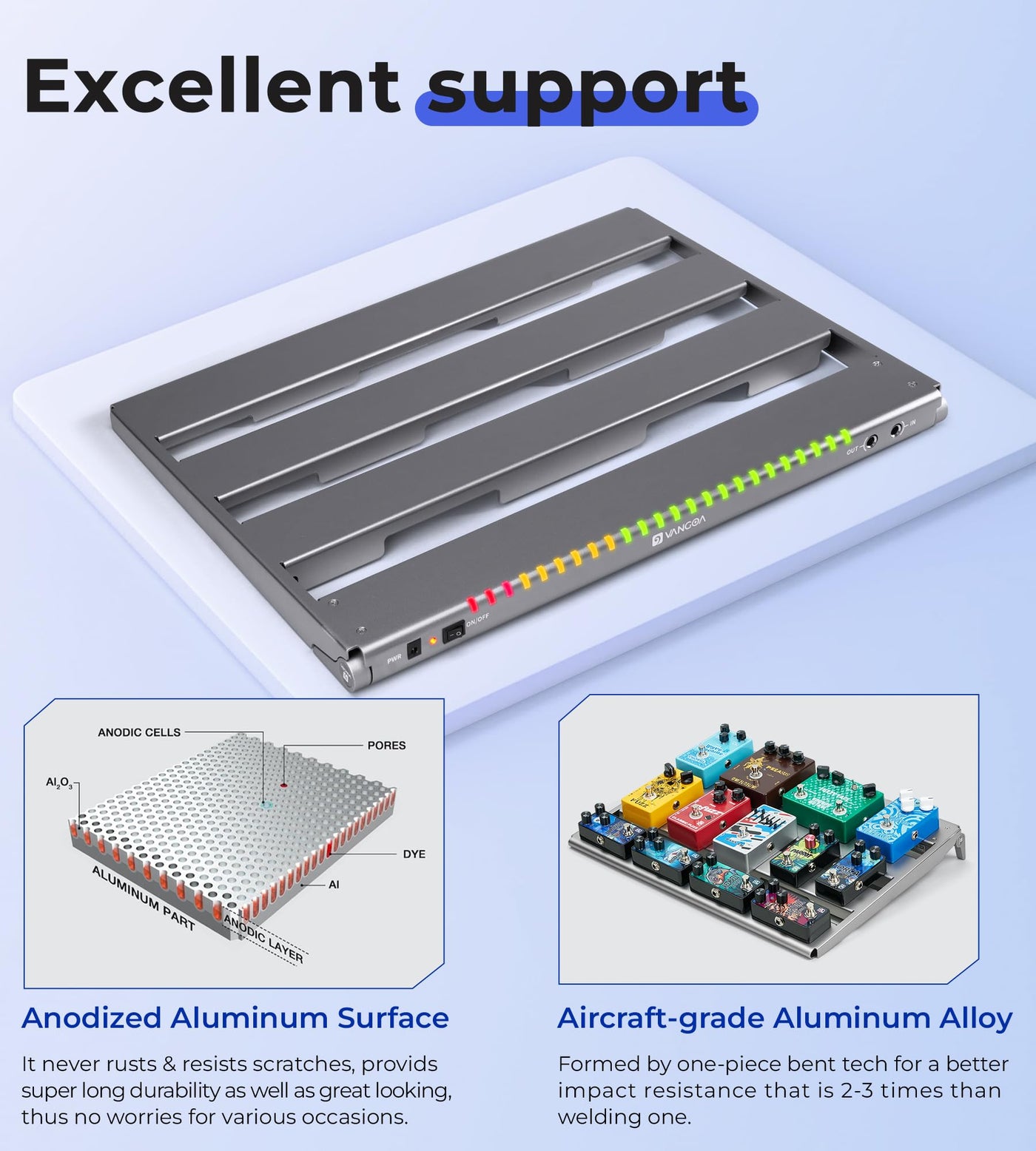 - Q: How does the Vangoa Pedal Board compare to traditional pedalboards? A: The Vangoa Pedal Board offers enhanced stability due to its one-piece-bent aluminum construction, making it more durable than many traditional models.
